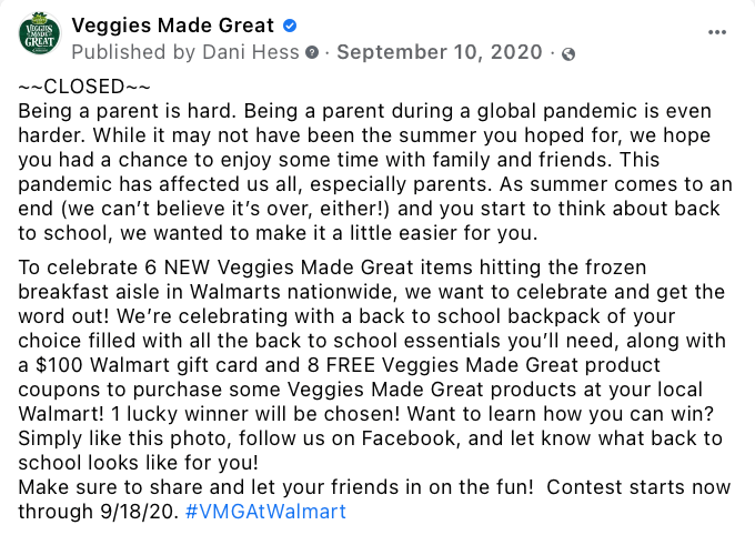 The purpose of this post was to promote Walmart distribution news. To gain brand awareness, this post was turned into a Giveaway ft. a Back To School theme, an event that Walmart is typically known for. The winnings were Veggies Made Great product coupons along with a Walmart Gift Card, & Back to School essentials from Walmart.
