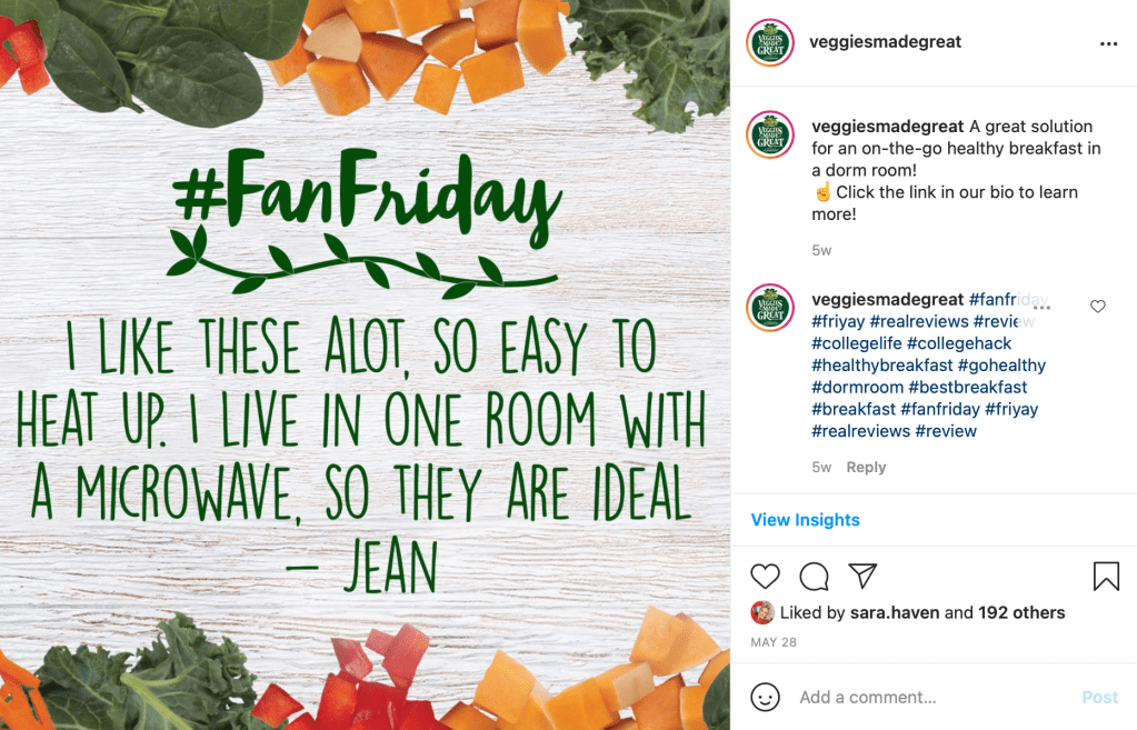 The purpose of this post was to create a fun social media post that wasn’t focused on a specific product, while still incorporating the brand message and ideals. The hashtag #Vegucation was to keep with the theme of the #1 ingredient in every Veggies Made Great product being vegetables. The goal was to get social media users to share the post with others to potentially get the brand in front of new customers.