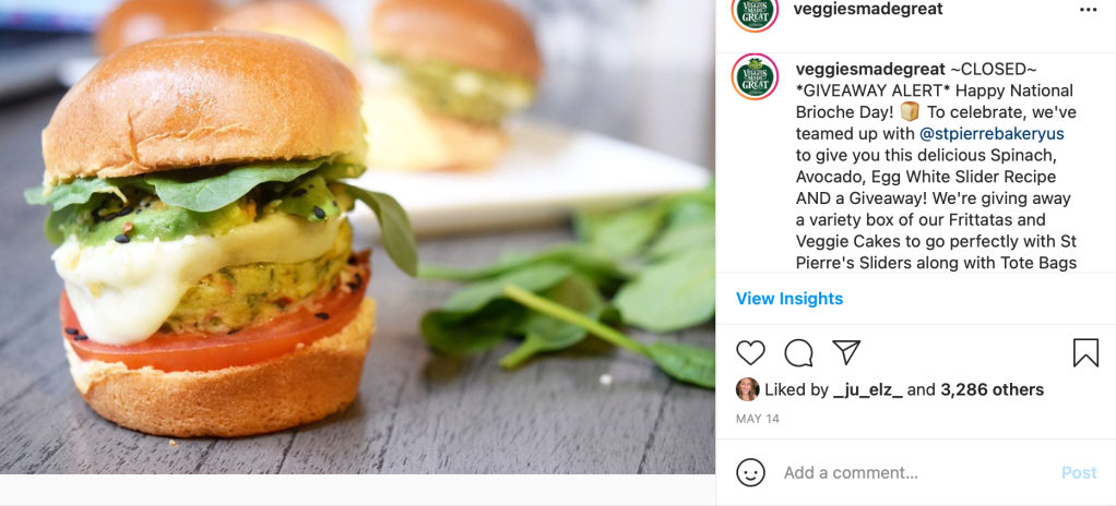 The purpose of this post was to team up with brioche brand, St. Pierre, for National Brioche day. The goal was to help St. Pierre with brand awareness in the US and cross promote to each other’s fan base. This post included a giveaway for a variety box of Veggies Made Great Frittatas and Veggie Cakes and St. Pierre Brioche Sliders to highlight the use case of how the two brands can be incorporated together. This post included a CTA which took users to a recipe page on veggiesmadegreat.com for Spinach, Avocado, Egg White Sliders. St. Pierre also launched a National Brioche Day page on their website which directed consumers to the Veggies Made Great recipe page.