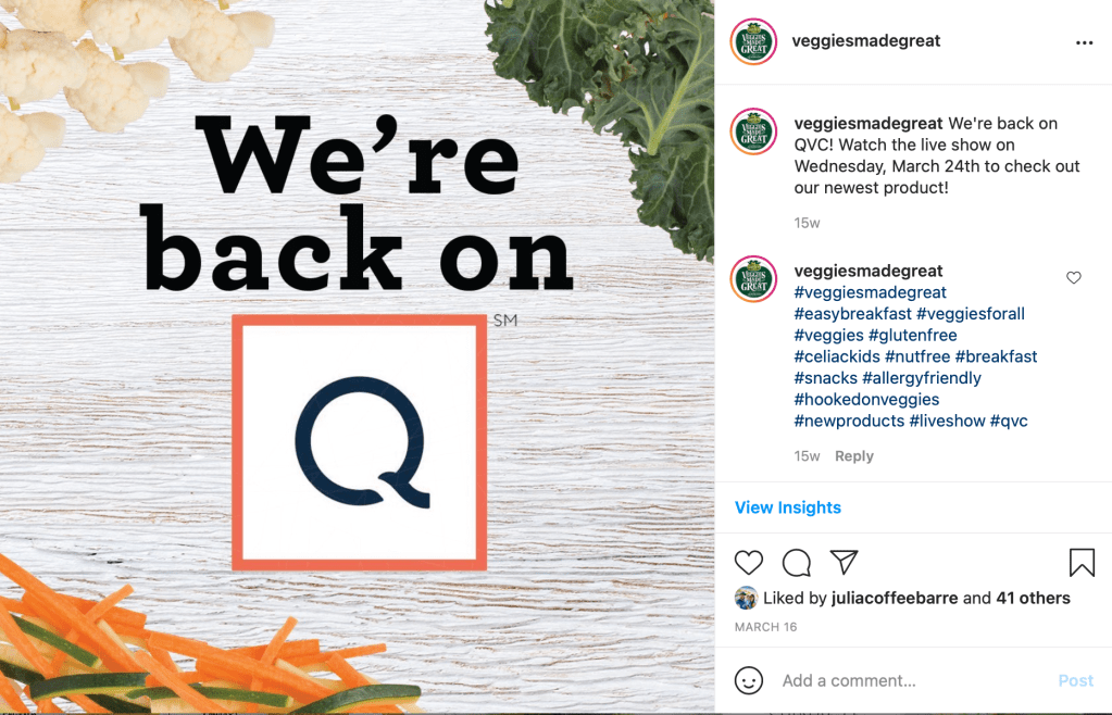 The purpose of this post was to to encourage social media users to watch a segment on QVC selling a new product from Veggies Made Great. This was to produce excitement from current fans, and encourage purchase of the items on QVC to increase ratings.