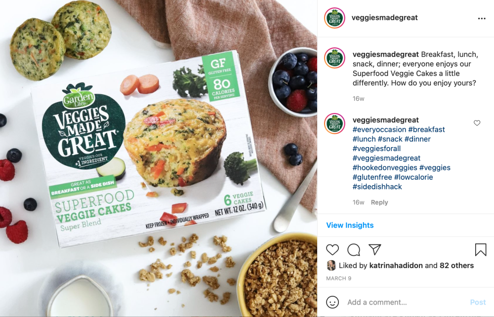 The purpose of this post was to attract web traffic and brand awareness. The CTA was to the home page of Veggies Made Great to learn more about the brand and products. The messaging featured a common concern of frozen foods being full of preservatives and unhealthy. Veggies Made Great looks to change that bad perception with all of their products, which is why this photo was chosen for this messaging.