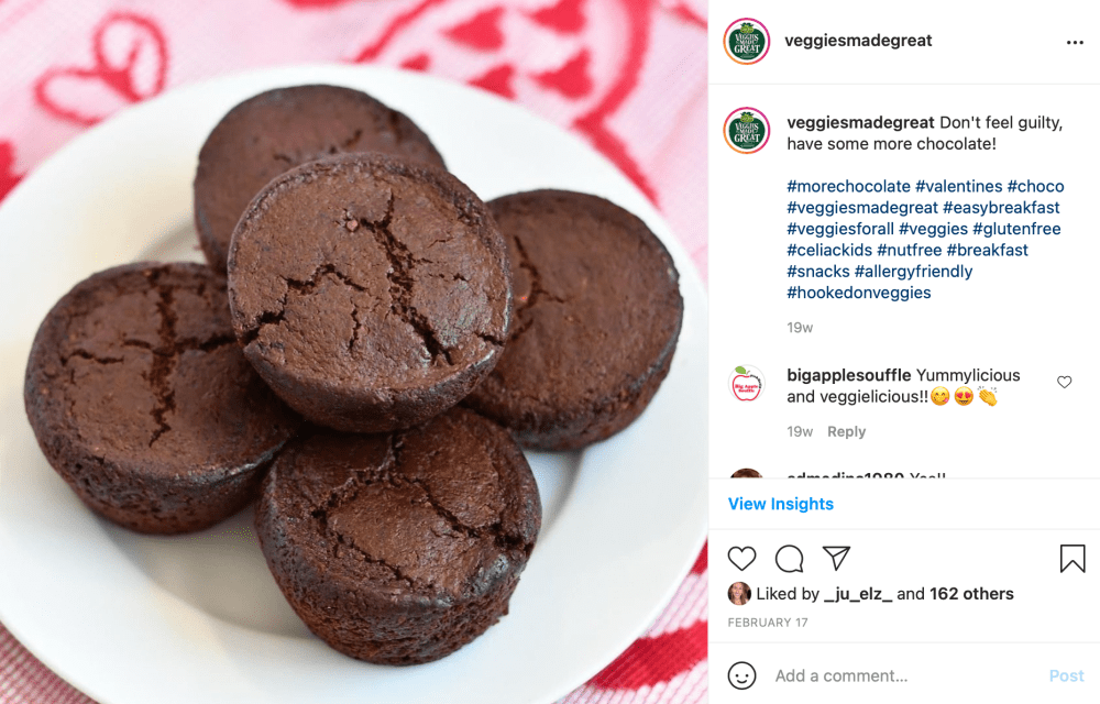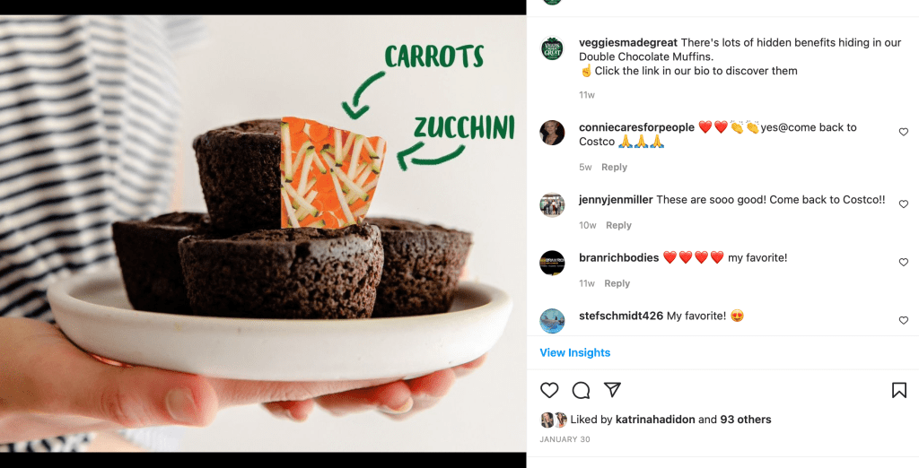 The purpose of this post was to brand awareness, with the CTA to the Double Chocolate Muffin product page to learn more. The design of the creative was to highlight the ingredients in the products: while you don’t notice the vegetables in the Double Chocolate Muffins, Zucchini & Carrots are the first 2 ingredients.