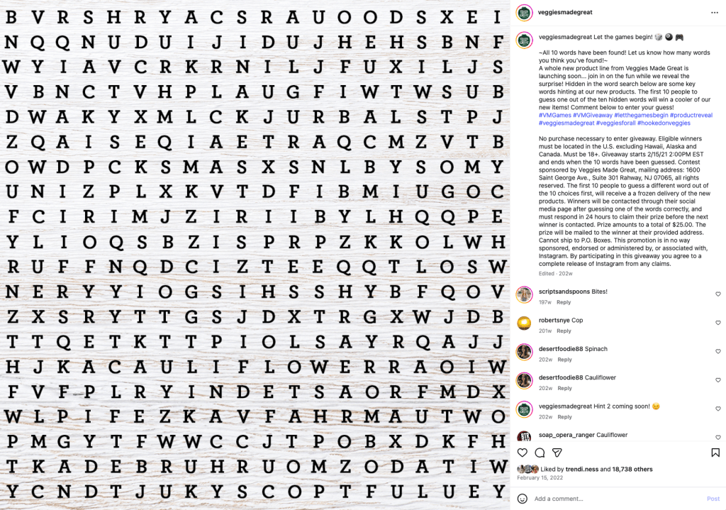 The purpose of this post was to tease the new launch for the Stuffed Cauliflower Bite product line. This was tied into a giveaway for the first 10 people to find the hidden words. Each winner received a shipment of the 4 new items.